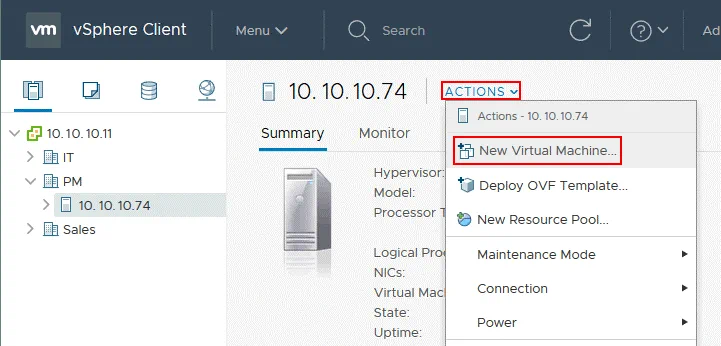 Vaya a Hosts y Clusters en VMware vSphere Client, seleccione el host ESXi necesario (10.10.10.74 en este caso), pulse Acciones y en el menú desplegado, pulse Nueva Máquina Virtual.
