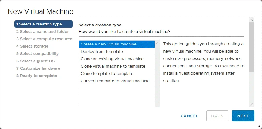 1. Seleccione un tipo de creación. Seleccione Crear una nueva máquina virtual. Haga clic en Siguiente para continuar con el siguiente paso.