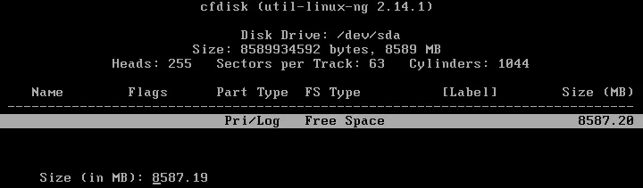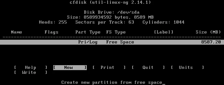 Ahora se abre la utilidad cfdisk. Seleccione Nuevo para crear una nueva partición de disco.