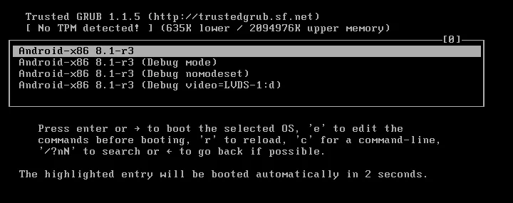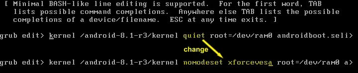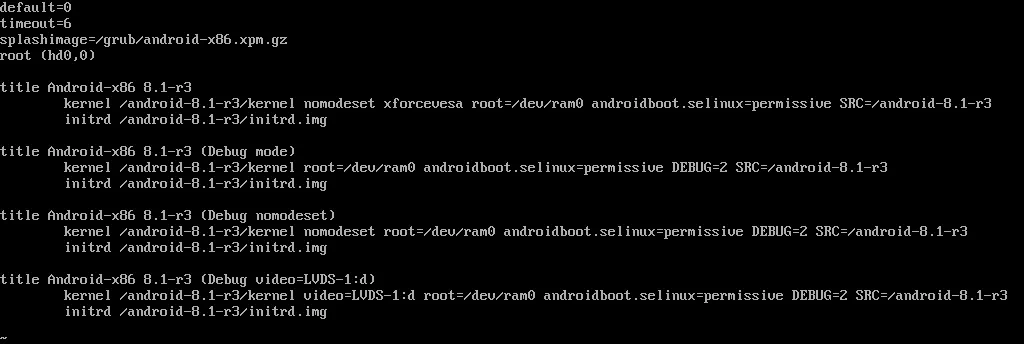 kernel /android-8.1-r3/kernel nomodeset xforcevesa root=/dev/ram0 androidboot.selinux=permissive SRC=/android-8.1-r3