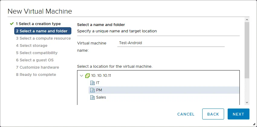 2. Seleccione un nombre y una carpeta. Introduzca un nombre para la nueva máquina virtual, por ejemplo, Test-Android. Seleccione un centro de datos y una carpeta VM en vCenter como ubicación para la VM.