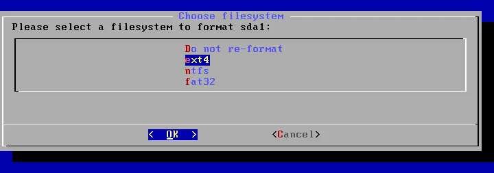 Elige el sistema de archivos. Seleccione ext4 como sistema de archivos para formatear la partición sda1 creada durante el paso previo avious.