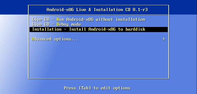 Después de crear una nueva máquina virtual, encienda la VM y arranque desde la imagen ISO virtual(android-x86_64-8.1-r3.iso) que seleccionó para utilizar por una unidad de CD/DVD virtual durante la creación de la VMware VM de Android.