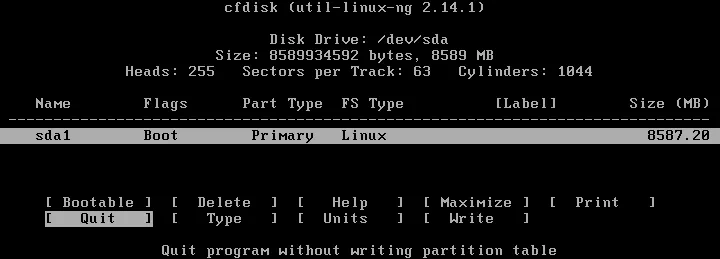 Ahora se ha creado la partición. Puede salir del cfdisk seleccionando la opción Salir.