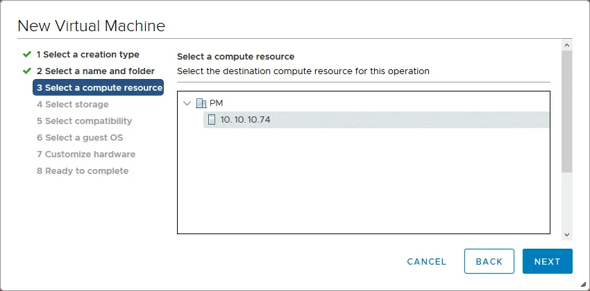 3. Seleccione un recurso informático. Seleccione el host ESXi de destino en el que debe ejecutarse una VMware Android VM. En nuestro caso, estamos utilizando el host ESXi 10.10.10.74.