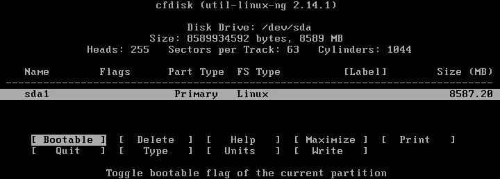 Después de crear una nueva partición, haz que la partición sea arrancable. Seleccione la partición, navigate a la opción Bootable, y pulse Intro.