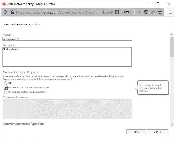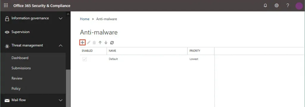 - En la página antimalware que se abre, haga clic en el icono + para crear una nueva directiva antimalware para Office 365 Advanced Threat Protection.