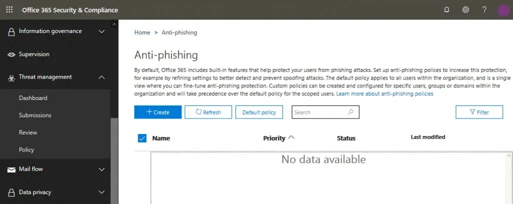 Se abre la página Anti-phishing. Si abre esta página por primera vez, la lista de políticas antiphishing estará vacía.