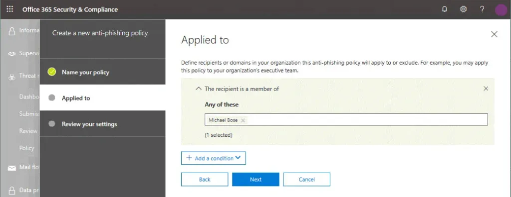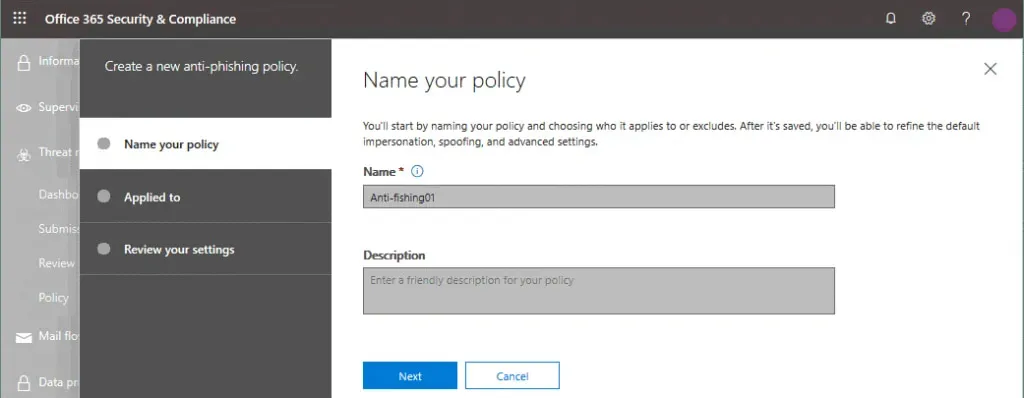 - Ponle nombre a tu póliza. Introduzca un nombre para la nueva política antiphishing. También puede introducir una descripción.