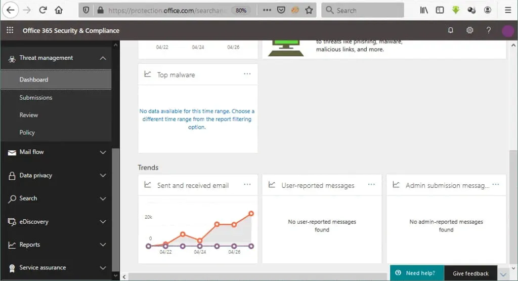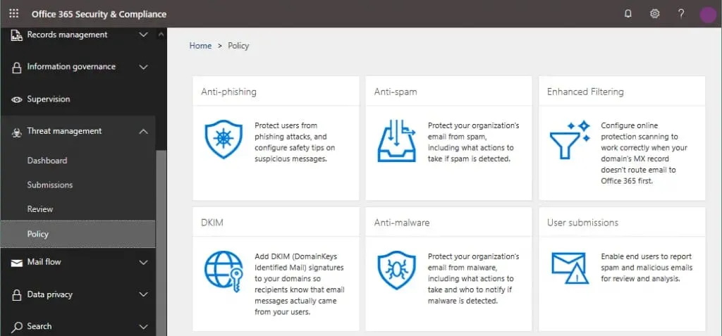 Como alternativa, puede abrir un enlace directo al centro de administración de Microsoft 365 Security & Compliance: https://protection.office.com