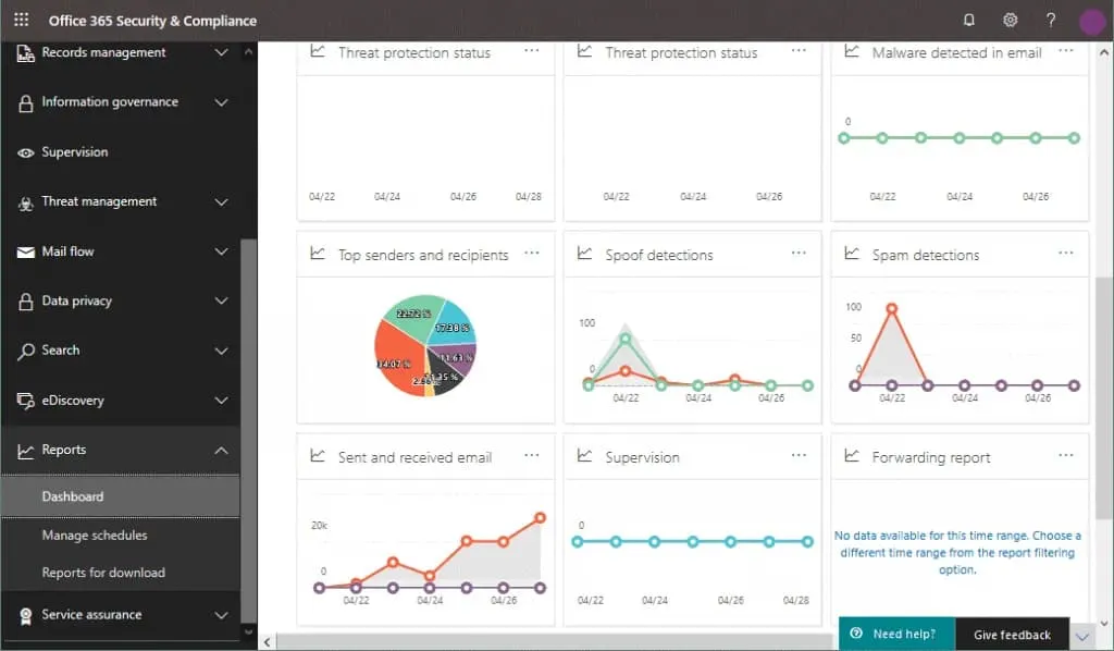 Los informes son útiles para ver el estado actual y las estadísticas de su entorno de Microsoft 365. En el panel de navegación del centro de administración de Office 365 Security & Compliance, haga clic en Informes > Panel para ver el panel con gráficos y diagramas.