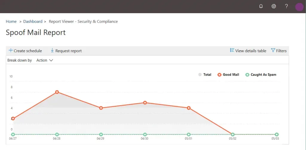 Pase el ratón por encima del gráfico para ver más información. Haga clic en el gráfico o diagrama que desee para abrirlo en modo de ventana completa y ver los detalles. Tras hacer clic en Detecciones de spoof, se muestra un informe detallado del correo de spoof.