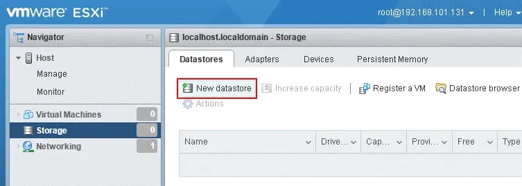 Vaya a Almacenamiento en el panel Navegador y haga clic en Nuevo almacén de datos.