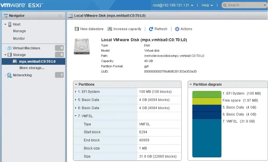 Cuando creé la máquina virtual ESXi 7.0.3, creé un disco virtual de 40 GB para la instalación de ESX. Debido a la nueva distribución de particiones en ESXi 7, se crea la partición VMFSL y no hay espacio para la partición VMFS que debe utilizarse para crear un almacén de datos en discos pequeños (menos de 128 GB). Por esta razón, no puedo almacenar VMs en el disco virtual utilizado para instalar ESXi 7.0.3 en esta VM, y necesito crear un segundo disco virtual para mi VM ESX7.