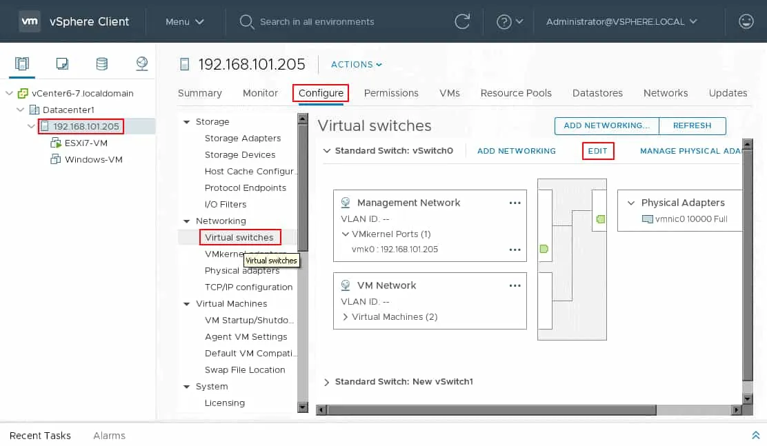 - A continuación, seleccione el conmutador virtual necesario(vSwitch0 en nuestro caso) y pulse Editar.