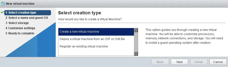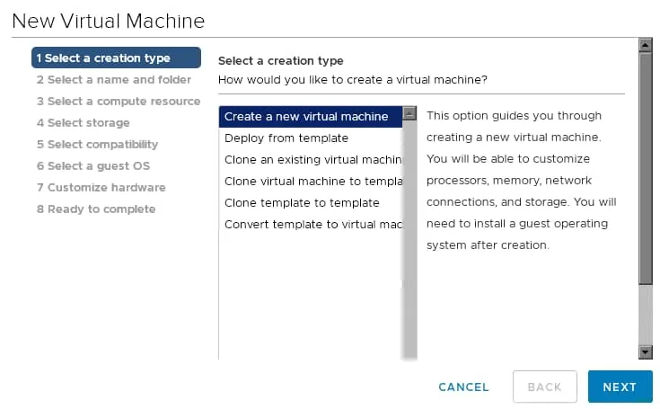 Seleccione Crear una nueva máquina virtual. Pulse Siguiente en cada paso del asistente para continuar.