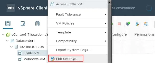 Edite los ajustes de la ESXi7-VM (para ello utilizamos VMware vSphere Client).