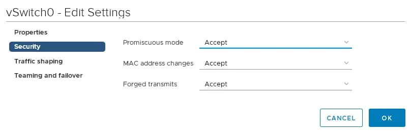 - Configure las políticas de seguridad para el conmutador virtual. Seleccione Aceptar para el modo Promiscuo, los cambios de dirección MAC y las transmisiones falsificadas. Pulsa OK para guardar los ajustes y cerrar la ventana.