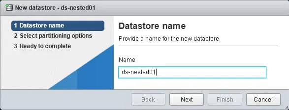 Seleccione Crear un nuevo almacén de datos VMFS e indique un nombre para el nuevo almacén de datos, por ejemplo, ds-nested01. Haga clic en Siguiente en cada paso para continuar.