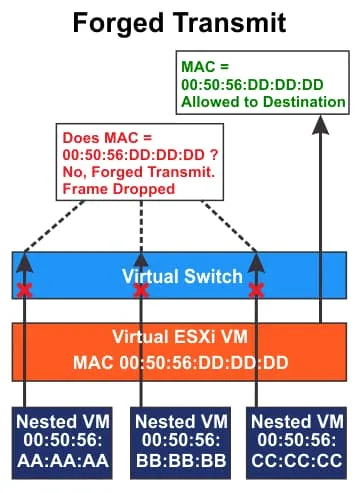 Cuando se utiliza la virtualización anidada ESXi, la dirección MAC de destino de una VM NIC (para una VM anidada) difiere de la dirección MAC del host virtual ESXi en el que se ejecutan las VM anidadas. Por esta razón, un switch virtual en un host físico ESXi deja caer estas tramas (si el modo Promiscuo está desactivado).