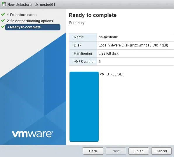 Se crea un almacén de datos. Puede utilizar este almacén de datos para almacenar una máquina virtual anidada (por ejemplo, una máquina virtual que ejecute Windows) en un hipervisor virtual VMware, es decir, ESXi 7.0.3 en mi caso.