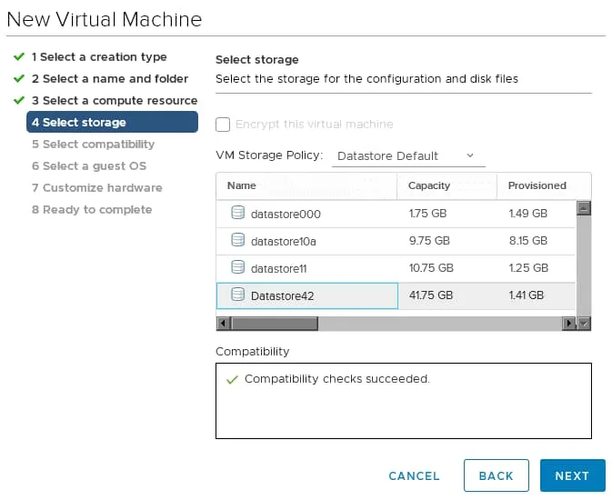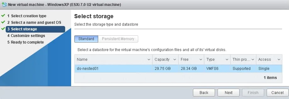 Seleccione el almacén de datos que ha creado anteriormente en el host virtual ESXi. Selecciono ds-nested01 para almacenar archivos VM.