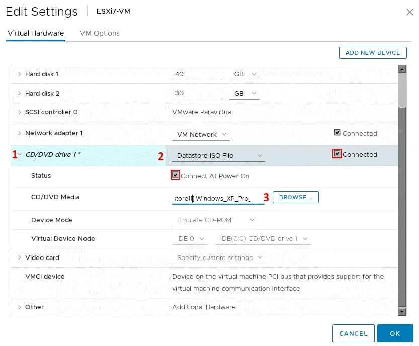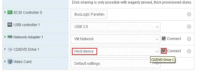 - Cargue la imagen ISO en el almacén de datos de un host ESXi físico. Monte esta imagen ISO en la unidad de CD/DVD de la máquina virtual ESXi7 en los ajustes de la máquina virtual ESXi7-VM. Seleccione Dispositivo host en los ajustes de VM de la VM Windows XP anidada al crear una nueva VM anidada. La opción Dispositivo host para una unidad de CD/DVD utilizada por una VM activa el modo pass-through y conecta una VM a una unidad de CD/DVD física del host ESXi físico. Como nuestro host ESXi 7.0.3 es virtual en un caso de virtualización anidada de VMware, la opción Host device conecta la unidad virtual de CD-DVD de la ESXi7-VM a la unidad virtual de CD/DVD de una VM anidada.