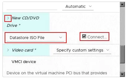 - En la línea Medios de CD/DVD, haga clic en Examinar y seleccione el archivo ISO en el almacén de datos.