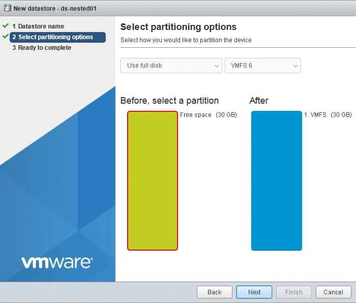 Como sólo hay un disco virtual libre, se selecciona este disco de 30 GB. Seleccione Usar disco completo y VMFS 6 en las listas desplegables correspondientes.