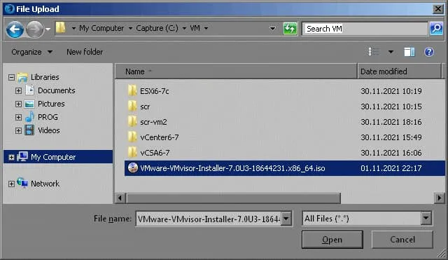 - Seleccione el archivo ISO necesario, pulse Abrir y espere hasta que el archivo ISO se cargue en el almacén de datos.