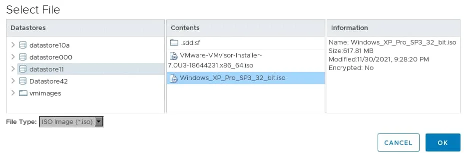 - Seleccione el archivo de imagen ISO de instalación de ESXi 7.0.3, que cargó previamente, en el almacén de datos.