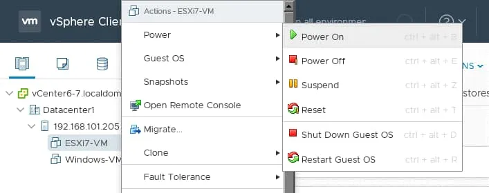 Una vez creada la máquina virtual, iníciela. Selecciono la ESXi7-VM en VMware vSphere Client, hago clic con el botón derecho en la VM y, en el menú Acciones, hago clic en Encendido>.