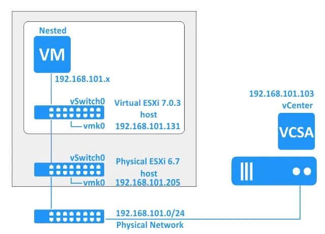 Con la parte teórica cubierta, ahora podemos pasar a la parte práctica y configurar la virtualización anidada de VMware. En este tutorial, voy a desplegar una máquina virtual que ejecuta ESXi 7.0.3 y ejecutar una máquina virtual Windows anidada en esa máquina virtual ESXi. Utilizo vSphere 6.7 incluyendo ESXi 6.7 en un servidor físico y vCenter 6.7. Este es un ejemplo de uso de la virtualización anidada ESXi cuando se necesita comprobar la última versión de VMware vSphere en el entorno vSphere existente.