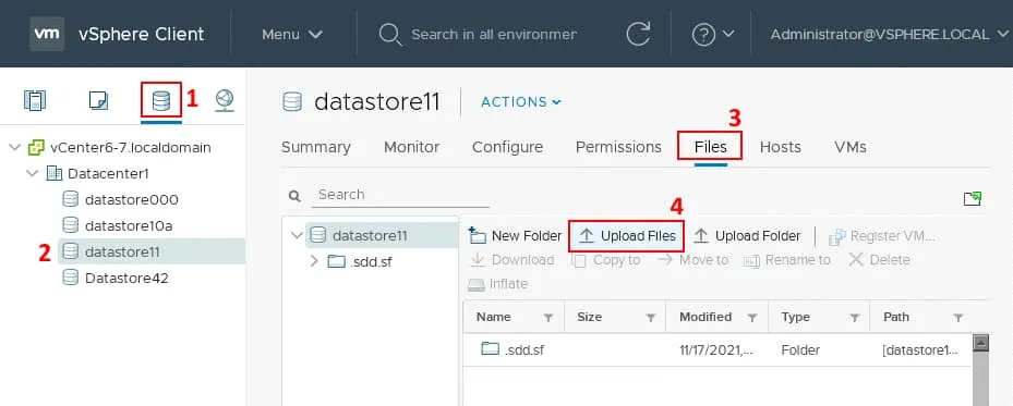 - Abra el cliente VMware vSphere y vaya a Datastores.