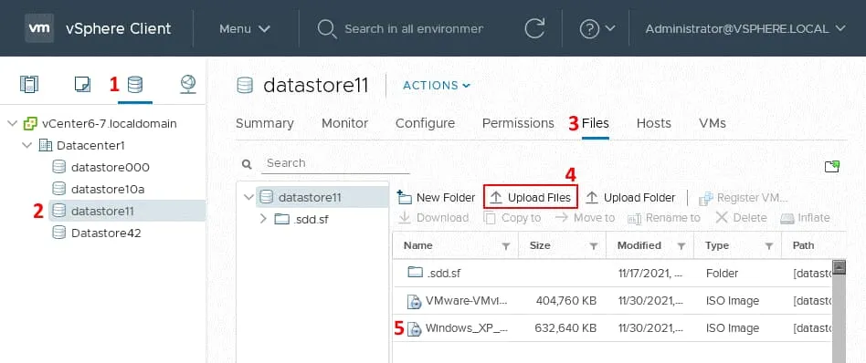 Cargue el archivo de imagen ISO de instalación de Windows XP en el almacén de datos(datastore11 en nuestro caso) tal y como hizo con el archivo de imagen ISO de ESXi 7.0.3 en vSphere Client.