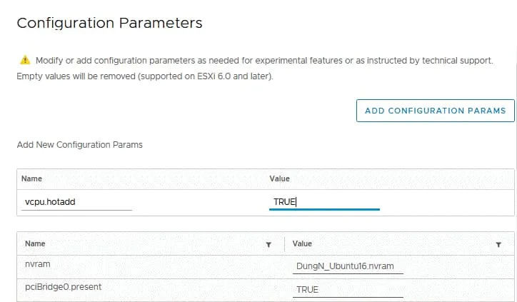 En la sección Add New Configuration Params introduzca los valores para habilitar VMware Hot Add memory y VMware vCPUs según corresponda.