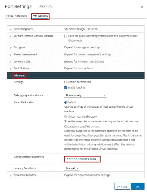 También puede editar la configuración de VMX en VMware vSphere Client: