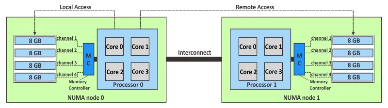 NUMA (acceso no uniforme a memoria) es la arquitectura para sistemas multiprocesador que permite a las CPU compartir memoria localmente. El tiempo de acceso a la memoria por parte de una CPU depende de la ubicación de la memoria en la placa base. Cada procesador tiene prioridad para utilizar «su propia» memoria local en lugar de utilizar la memoria instalada en las ranuras cercanas a otro procesador. En otras palabras, NUMA es un método que determina cómo interactúa un procesador con los módulos de memoria de otro procesador. Los sistemas NUMA son plataformas con más de un bus de sistema en las que cada procesador puede acceder a toda la memoria de la placa base. Un procesador con memoria instalada en ranuras cercanas a este procesador se denomina nodo NUMA.