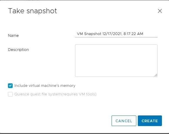 - En la parte inferior de la pantalla Tomar instantánea, se selecciona por defecto Incluir la memoria de la máquina virtual. Esa es la opción para crear una instantánea del estado de la memoria. Tenga en cuenta que la opción de instantáneas en reposo está atenuada porque las instantáneas del estado de la memoria y las instantáneas en reposo no se pueden tomar simultáneamente.