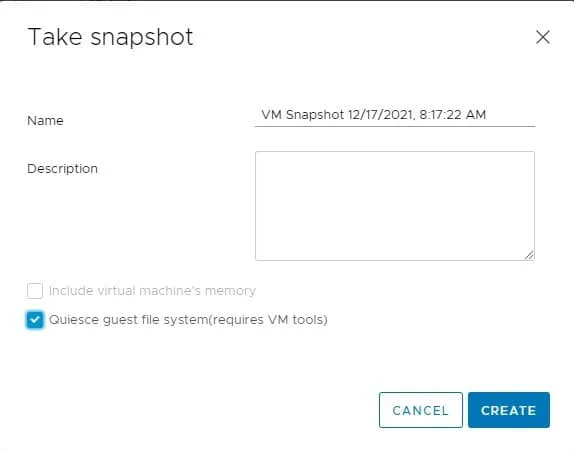 - Anule la selección de Incluir la memoria de la máquina virtual y marque Quiesce guest file system. Haga clic en Crear.