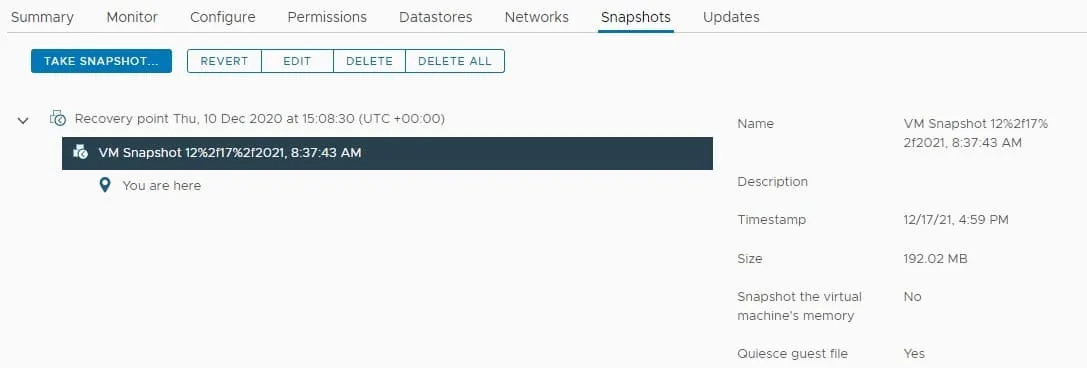 - Una vez creada la instantánea, podrá verla en la pestaña Instantáneas del panel de control de la máquina virtual. Desde ahí, puedes volver a esa instantánea, editarla o eliminarla.